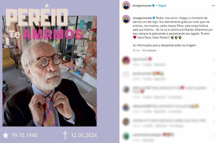 Cissa e Paulo foram casados entre os anos de 1976 e 1990. Anteriormente, ela havia lamentado a morte do ex-companheiro. “Peréio, grande amor da minha vida, te sinto e te tenho nos nossos ‘sucedâneos’, Thomaz e João, que você pediu tanto para mim. Te agradeço, meu amor, por tanto aprendizado e amor. Era uma menina e você me mostrou o mundo e o amor pelo nosso ofício”, escreveu.
