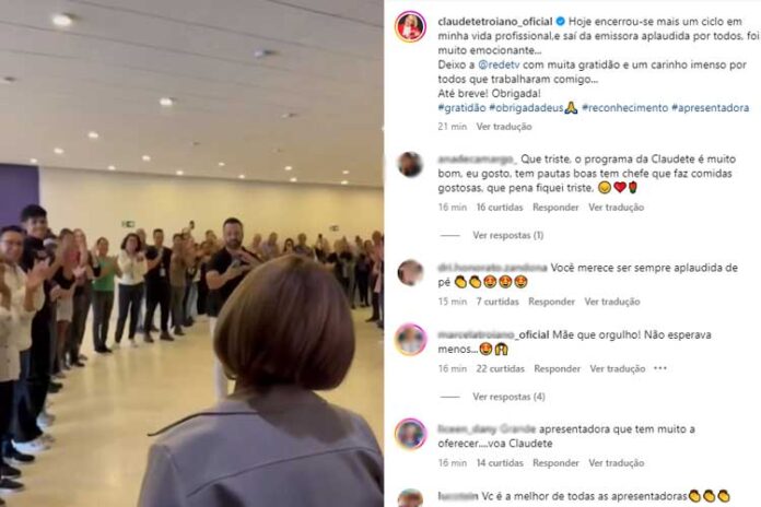 “Hoje encerrou-se mais um ciclo em minha vida profissional, e saí da emissora aplaudida por todos; foi muito emocionante… Deixo a @redetv com muita gratidão e um carinho imenso por todos que trabalharam comigo… Até breve! Obrigada!”, agradeceu Troiano, recebendo aplausos de seus colegas.