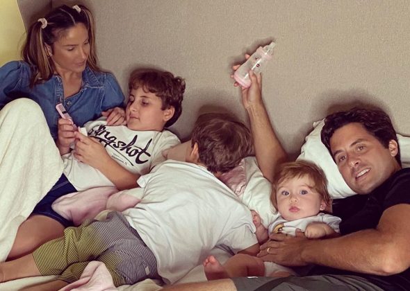 Nesta segunda-feira (15), Claudia Leitte compartilhou um momento fofo ao lado da família. Na imagem, ela aparece com um penteado de ‘maria chiquinha’ e ao lado do marido, Márcio Pedreira, e dos filhos Rafael, Davi e Bela, todos amontoados na cama de casal