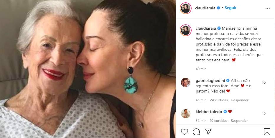 “Mamãe foi a minha melhor professora na vida, se virei bailarina e encarei os desafios dessa profissão e da vida foi graças a essa mulher maravilhosa! Feliz dia dos professores a todos esses heróis que tanto nos ensinam!”, escreveu Claudia na legenda do post feito no Instagram.