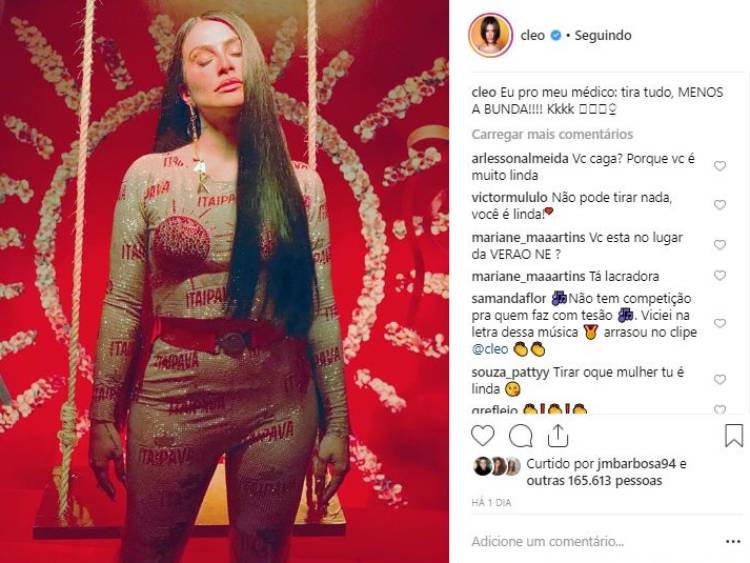 Os seguidores elogiaram o corpo da atriz e uma fã disse que ela não precisava ‘tirar’ nada. “Eu queria, eu fui e fiz”, respondeu Cleo. “Mas eu me amo mesmo assim”, ressaltou.