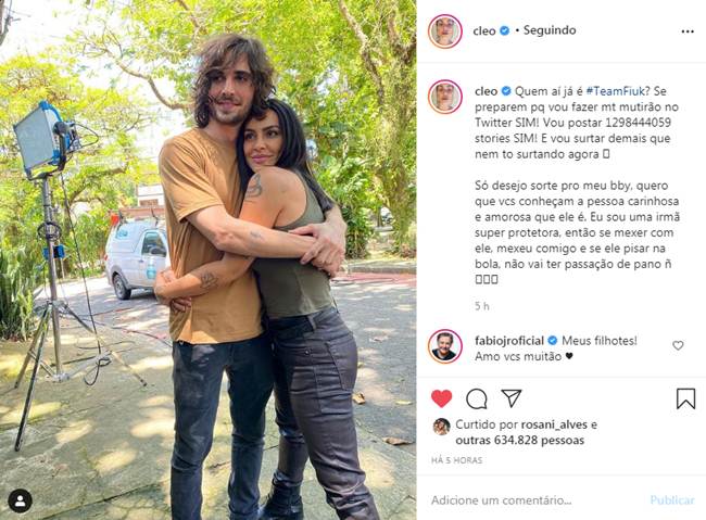 Nesta quarta-feira (20), Cleo ressaltou sua torcida pelo irmão, Fiuk. Ela publicou uma foto junto com o cantor em seu perfil no Instagram. “Quem aí já é #TeamFiuk? Se preparem pq vou fazer mt mutirão no Twitter SIM! Vou postar 1298444059 stories SIM! E vou surtar demais que nem to surtando agora”, avisou.