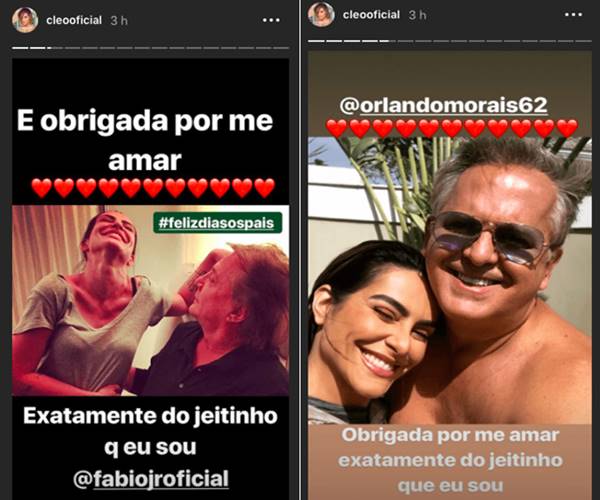 Fruto do relacionamento entre a atriz global Gloria Pires e do cantor Fabio Junior, Cleo usou o Instagram para homenagear tanto o pai biológico quanto o padrasto, Orlando Morais.