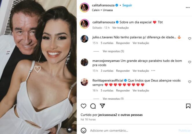 No vídeo divulgado, Calita Franciele Miranda mostra momentos românticos do casal e o buquê de rosas que ela ganhou de Amado na data. “Sobre um dia especial”, escreveu a Miss na postagem. Nos comentários da publicação, diversos internautas reagiram: “Lindos, felicidades Calita“, desejou uma. “Parabéns, aproveita o vovô rsrs“, brincou outra. “Que sejam felizes“, escreveu mais uma internauta.