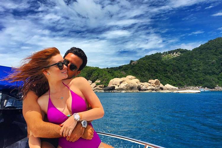 A atriz postou em seu Instagram, fotos de seu passeio de barco com o amado pela ilha de Koh Samui. Em uma das imagens, os dois aparecem agarradinhos. Em outro click, Marina chamou a atenção usando um maiô decotado exibindo o corpão.
