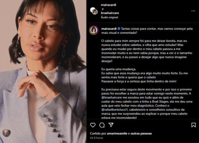 E é claro que os internautas não poderiam deixar este momento passar como despercebido. Rapidamente, trataram de comentar a respeito da transição capilar de Maíra. Os usuários da rede social em questão fizeram as seguintes considerações sobre o tema: ”Acho que a franja que não ficou boa não”. ”Ganhou muitas cifras pra fazer essa mudança radical”. ”Olha vou te contar, se a pessoa não estiver em dias com a terapia ela enlouquece com tanta gente vazia na alma e no coração”.
