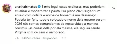 “É muito legal essas releituras, mas poderiam atualizar e modernizar a pauta. Em pleno 2026 sugerir um ensaio com coleira e nome de homem é um desserviço. Poderia ter feito tudo e colocado o nome dela mesmo pq em 2026 nós somos comandantes da nossa vida e a menina construiu as coisas dela por ela mesma, ela seguirá sendo Virgínia com ou sem o namorado”, escreveu a comentarista em publicação do Gshow, onde as fotos foram compartilhadas originalmente.