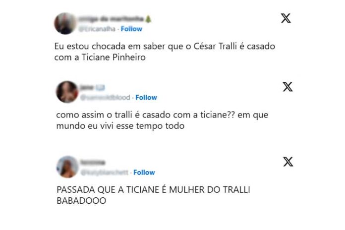 “Como assim? O Tralli é casado com a Ticiane? Em que mundo eu vivi esse tempo todo?”, perguntou uma internauta. “E estou chocada em saber que o César Tralli é casado com a Ticiane Pinheiro”, afirmou outra. “Passada que a Ticiane é mulher do Tralli. Babado!”, completou mais uma, demonstrando não saber da informação.