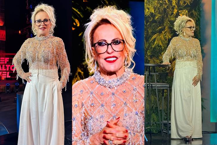 Look 7 – Usando calça e com uma blusa cheia de brilhos para comandar a final do reality culinário Chef de Alto Nível na Globo.