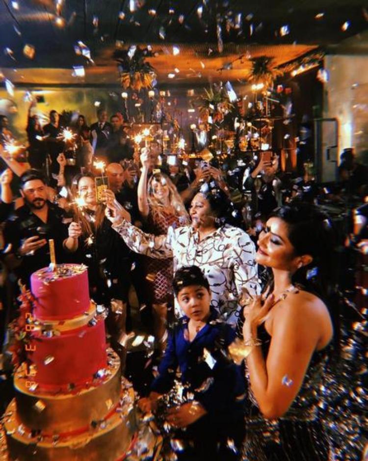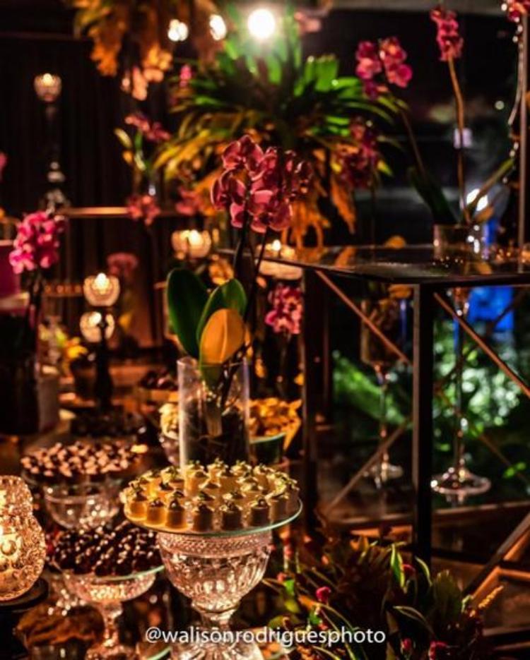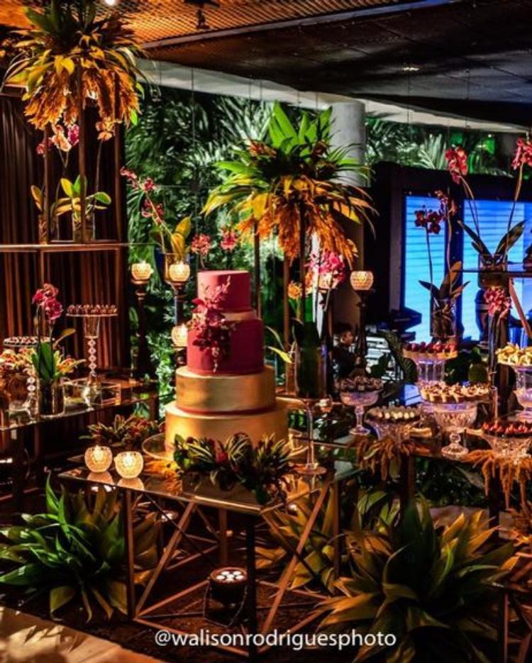 A comemoração aconteceu esta semana e contou com itens luxuosos, com bastante dourado. A decoração contou também com bastante plantas, deixando a mesa de doces parecendo com um jardim interno.