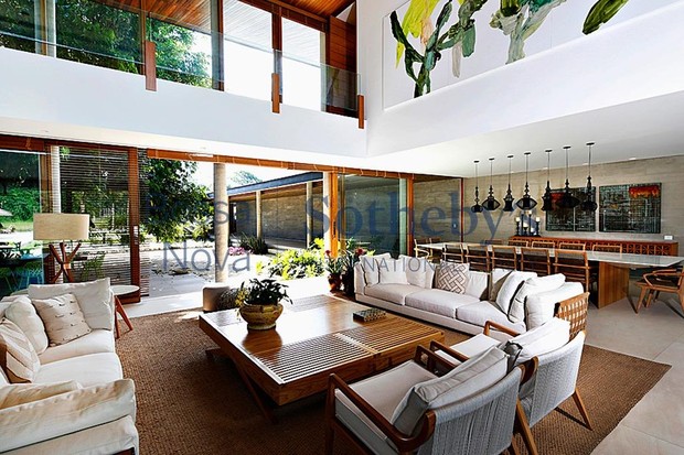 As suítes da casa de Neymar têm uma vista privilegiada para a imensa área verde da região. A sala principal, por exemplo, é decorada com vários sofás brancos e tem uma mesa de jantar com 14 lugares.