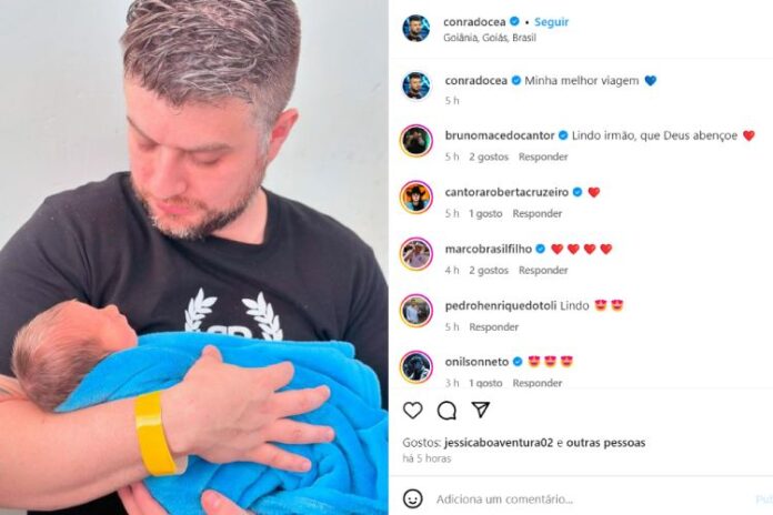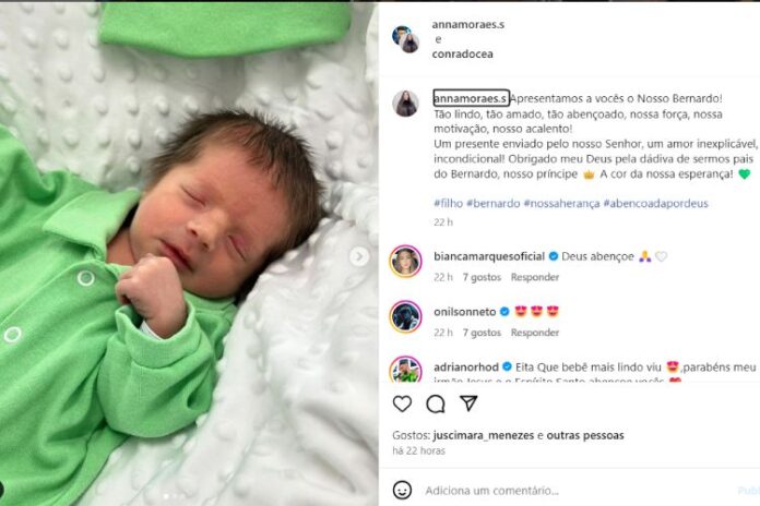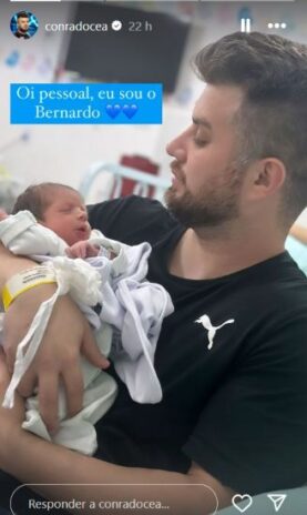 Horas antes, o casal publicou uma imagem de Bernardo e o apresentaram para o público da rede social. A postagem foi feita pela esposa do cantor no Instagram: “Apresentamos a vocês o nosso Bernardo! Tão lindo, tão amado, tão abençoado, nossa força, nossa motivação, nosso acalento! Um presente enviado pelo nosso Senhor, um amor inexplicável, incondicional! Obrigado meu Deus pela dádiva de sermos pais do Bernardo, nosso príncipe. A cor da nossa esperança!”, escreveu Anna Moraes, compartilhando a postagem na conta de Conrado também.