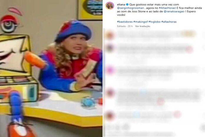 Na legenda, Eliana destacou sua felicidade em reencontrar o amigo, desta vez na telinha da Globo. “Que gostoso estar mais uma vez com @serginhogroisman, agora no #AltasHoras! E fica melhor ainda ao som de Joss Stone e ao lado de @renatoaragao! Espero vocês!”, afirmou.