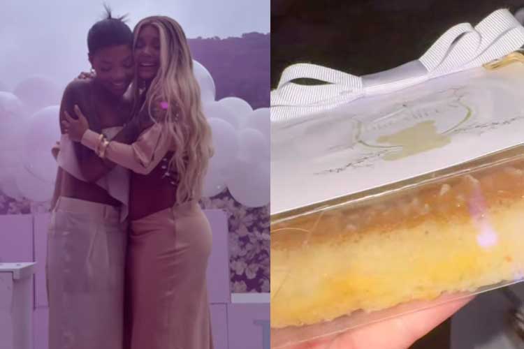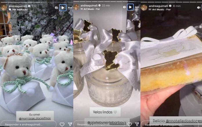 Os convidados da celebração compartilharam detalhes sobre as lembrancinhas dadas aos participantes. Entre os itens estão uma vela personalizada com ursinho dourado, fatia de bolo em uma caixa de acrílico com talher dourada e docinho com urso de pelúcia.