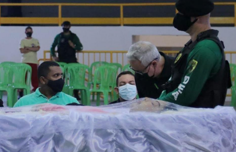 Clevinho Santos, viúvo da cantora, não sai de perto do caixão desde a madrugada, quando ocorreu outro velório, no Centro da cidade, restrito a familiares.