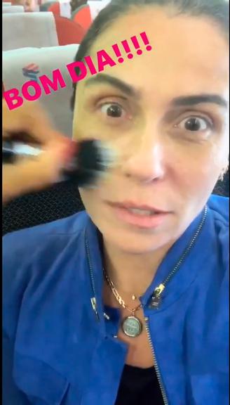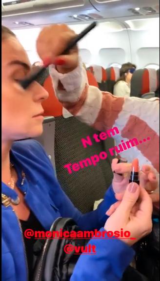 Foi o que fez a atriz Giovanna Antonelli, que compartilhou com os seguidores, um momento em que aparece dentro do avião, fazendo a make do dia, mostrando que não tem tempo para esperar e que precisa “correr”. A fashionista Monica Ambrósio a ajudou na situação: “Como é que começa a nossa madrugada? Quem não tem cão, caça com gato“, brincou a atriz.