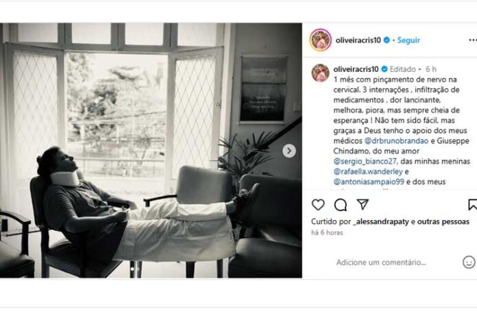 “1 mês com pinçamento de nervo na cervical. 3 internações, infiltração de medicamentos, dor lancinante, melhora, piora, mas sempre cheia de esperança!”, afirmou. Apesar de os últimos dias não estarem sendo fáceis, Cristiana afirmou que pôde contar com o apoio de seus médicos, que tiveram bastante compreensão diante o seu problema.