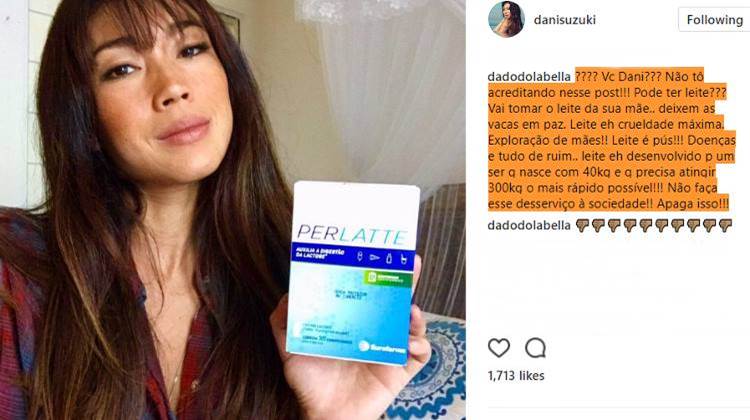 Dado Dolabella, fez questão de comentar no post da atriz, mostrando sua indignação: “Você, Dani? Não tô acreditando nesse post! Pode ter leite? Vai tomar o leite da sua mãe, deixem as vacas em paz. Leite é crueldade máxima. Exploração de mães! Leite é pus! Doenças e tudo de ruim. Leite é desenvolvido pra um ser que nasce com 40kg e que precisa atingir 300kg o mais rápido possível! Não faça esse desserviço à sociedade! Apaga isso“, detonou o ator recriminando Dani por incentivar o consumo de leite e a crueldade aos animais.