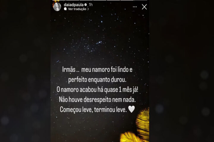 “Irmãs, meu namoro foi lindo e perfeito enquanto durou. O namoro acabou há quase 1 mês já! Não houve desrespeito nem nada”, escreveu, negando também a suposta traição de Caio. “Começou leve, terminou leve”, destacou a comunicadora.