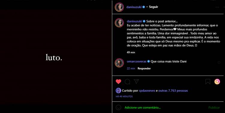 Em seu perfil no Instagram, ela fez um post de ‘luto’. Sobre o post anterior… Eu acabei de ter notícias. Lamento profundamente informar, que o menininho não resistiu. Perdemos! Meus mais profundos sentimentos a família”, escreveu.