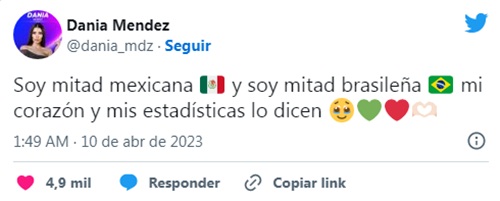 Nas redes sociais, a modelo já expressou seu carinho pelo Brasil. “Sou metade mexicana e metade brasileira. É o que dizem meu coração e minhas estatísticas”, escreveu Dania Mendez em seu perfil no Twitter.