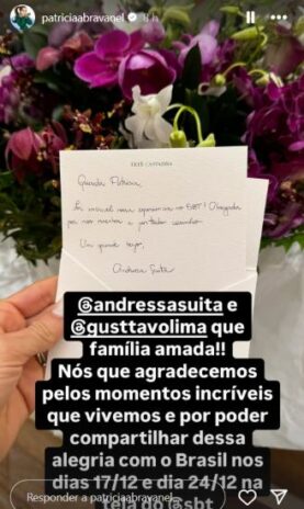 “Andressa Suita e Gusttavo Lima, que família amada! Nós que agradecemos pelos momentos incríveis que vivemos e por poder compartilhar dessa alegria com o Brasil nos dias 17/12 e 24/12, na tela do SBT”, respondeu Patrícia Abravanel, apresentadora dominical.