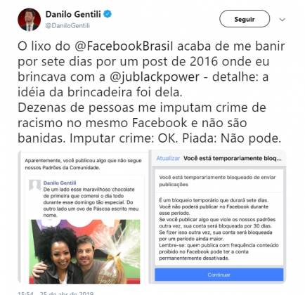 “O lixo do Facebook acaba de me banir por sete dias por um post de 2016 onde eu brincava com a @jublackpower – detalhe: a ideia da brincadeira foi dela. Dezenas de pessoas me imputam crime de racismo no mesmo Facebook e não são banidas. Imputar crime: OK. Piada: Não pode”, escreveu.