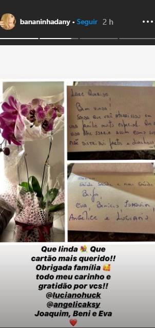 Em meio a tanta emoção, Dany recebeu o carinhos de muitas pessoas que torcem por ela e desejaram boas-vindas à pequena. Várias foram as mensagens e presentes, inclusive, da família de Luciano Huck e da apresentadora Angélica. O casal carinhosamente, em nome da família, enviou um presente especial para brindar a nova fase da assistente de palco, eles enviaram uma linda orquídea e uma carta de próprio punho.