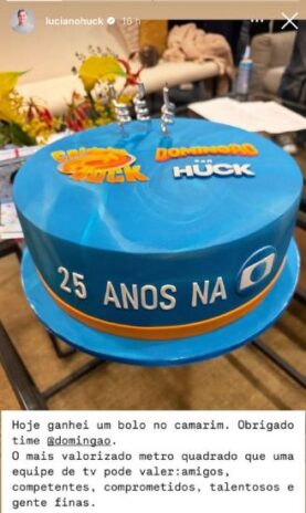 “Hoje ganhei um bolo no camarim. Obrigado, time Domingão! O mais valorizado metro quadrado que uma equipe de tv pode valer: amigos competentes, comprometidos, talentosos e gente finas”, escreveu e finalizou Luciano Huck em suas redes sociais.