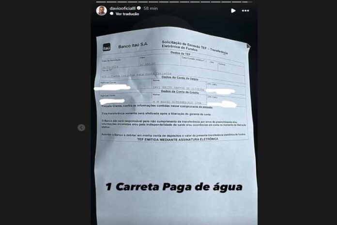 O baiano ainda prometeu zerar o estoque de água no mercado, mostrando também o comprovante da compra no valor de R$ 41.880,20. “Carreta paga de água”, escreveu ele na legenda.
