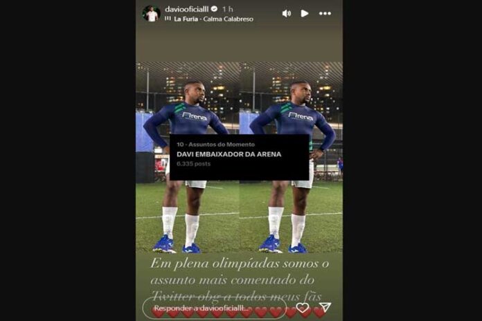 O baiano compartilhou um Story após ficar entre os assuntos mais comentados do X (antigo Twitter), aproveitando para agradecer a todos os seus fãs. “Em plena Olimpíada, somos o assunto mais comentado do Twitter. Obrigado a todos os meus fãs”, disse Davi.