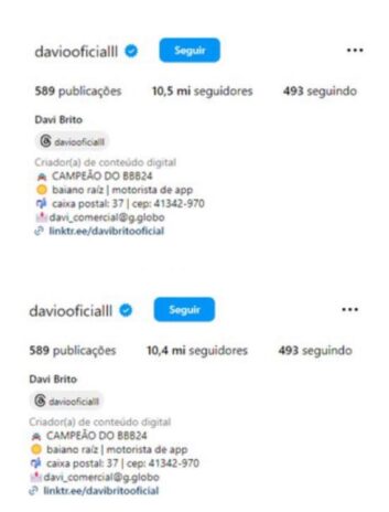 Em sua conta oficial do Instagram é possível perceber que antes o baiano possuía 10,5 milhões de seguidores e agora está com 10,4 milhões. Alguns usuários da rede social em questão resolveram comentar sobre o caso: ”Separou msm oxe”. ”Davi pitangueiro não gostei da sua atitude com a mani”. ”Quem Deixou de seguir”. ”Tropa de quem acabou de deixar de seguir o Davi”.