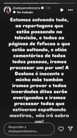 Em seguida do pronunciamento, Dayanne ainda publicou um texto: “Estamos salvando tudo. As reportagens que estão passando na televisão. E todas as páginas de fofoca, o que estão soltando. E aliás, comentários de todas as pessoas, iremos processar um por um”.