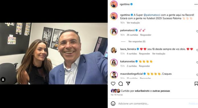Pelas redes sociais, o jornalista e apresentador do ‘Balanço Geral SP’, Reinaldo Gottino, compartilhou o primeiro clique de Paloma Tocci em sua nova emissora, recebendo ela com grande alegria: “A Super @palomatocci com a gente aqui na Record! Estará com a gente no futebol 2025! Sucesso Paloma 👏🏻👏🏻👏🏻“, publicou ele, no feed do Instagram.