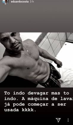Já em uma foto, também compartilhada em seu Stories na rede social, Eduardo exibiu mais uma vez, o seu corpo e escreveu: “To indo devagar mas to indo. A máquina de lava: já pode começar a ser usada kkkk.”