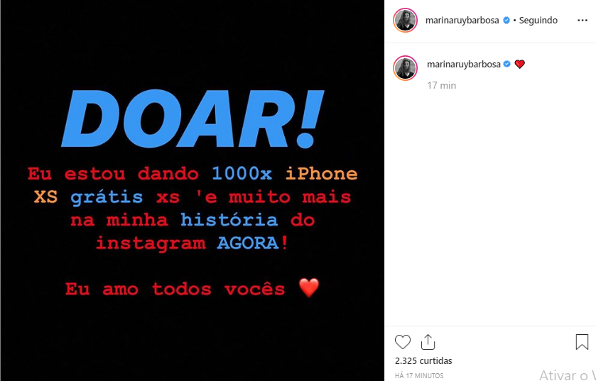 A imagem que tomou conta do feed, de quem acessava no Instagram, era a mesma que foi vinculada antes, que informava aos seguidores de Marina, que a mesma estaria doando vários aparelhos celulares.