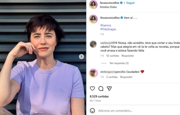 Através de seu perfil nas redes sociais, Fernanda compartilhou o primeiro vislumbre sobre o seu novo visual no folhetim. A estrela surgiu com o cabelo curto e aproveitou para fazer mistério. “Vem aí… #Samira #TrêsGraças”, escreveu na legenda. “Nossa, não acredito, teve que cortar o seu lindo cabelo? Mas que alegria em vê-la te volta as novelas, porque você arrasa e estava fazendo falta”, comentou uma fã. “Saudades!”, disse outro.