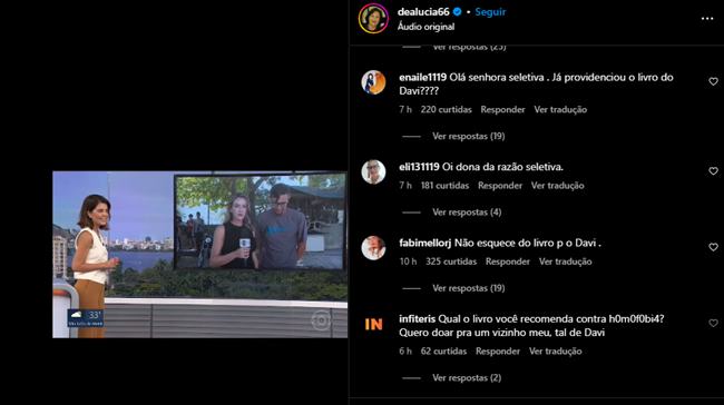 Os usuários da rede social em questão disseram o seguinte: ”Só lembrando senhora não esqueça do livrinho do Davi sobre homofobia e machismo. Pq passar á mão na cabeça não dá”. ”Oi dona da razão seletiva”. ”Olá senhora seletiva . Já providenciou o livro do Davi????”. ”E Davi pode tratar as mulheres e o restante da casa como ele trata,?”. ”A senhora não deveria estar tricotando um cardigan para seus netos??? Lacradora de Taubaté”.