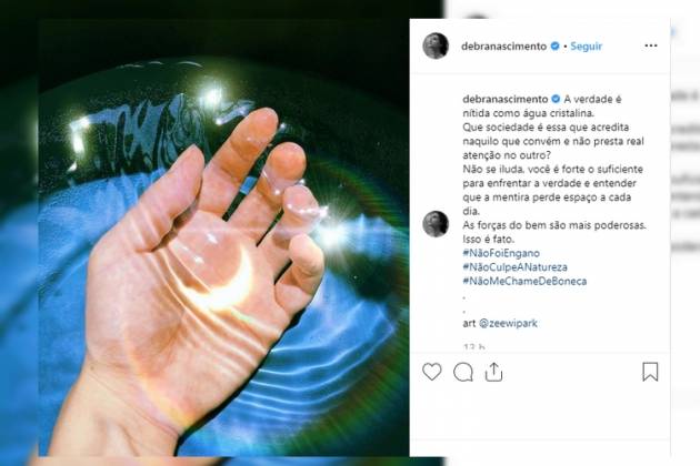 “A verdade é nítida como água cristalina. Que sociedade é essa que acredita naquilo que convém e não presta atenção no outro? Não se iluda, você é forte o suficiente para enfrentar a verdade e entender que a mentira perde espaço a cada dia. As forças do bem são mais poderosas. Isso é fato”, escreveu ela, que acrescentou as hashtags “Não foi engano”, “Não culpe a natureza” e “Não me chame de boneca”.