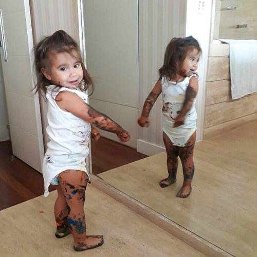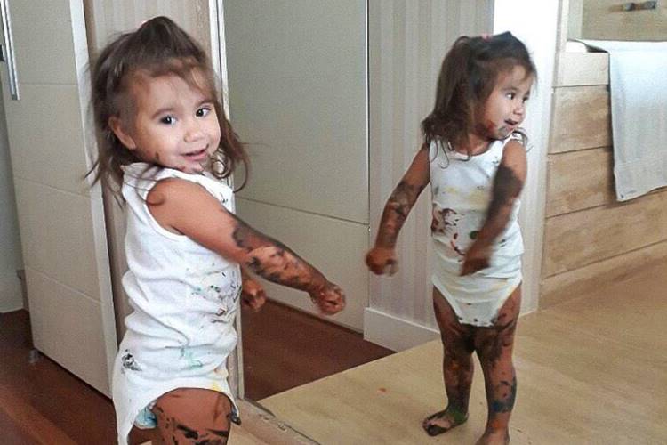 “Não fui eu que mexi nas tintas, foi ela, mamãe!!!”, brincou a atriz na legenda ao mostrar a menina de 1 ano se olhando no espelho.