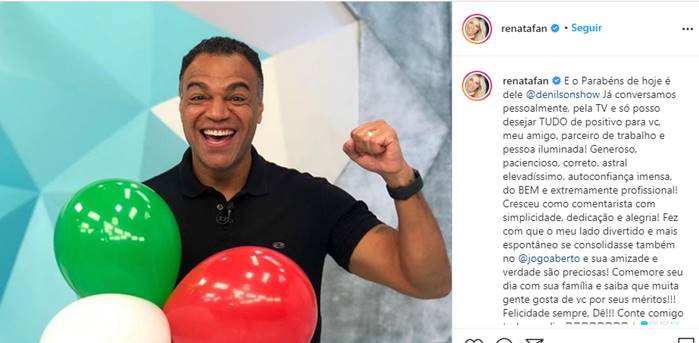 “E o Parabéns de hoje é dele @denilsonshow Já conversamos pessoalmente, pela TV e só posso desejar TUDO de positivo para vc, meu amigo, parceiro de trabalho e pessoa iluminada! Generoso, paciencioso, correto, astral elevadíssimo, autoconfiança imensa, do BEM e extremamente profissional! Cresceu como comentarista com simplicidade, dedicação e alegria! Fez com que o meu lado divertido e mais espontâneo se consolidasse também no @jogoaberto e sua amizade e verdade são preciosas! Comemore seu dia com sua família e saiba que muita gente gosta de vc por seus méritos!!! Felicidade sempre, Dê!!! Conte comigo todos os dias”, escreveu ela.