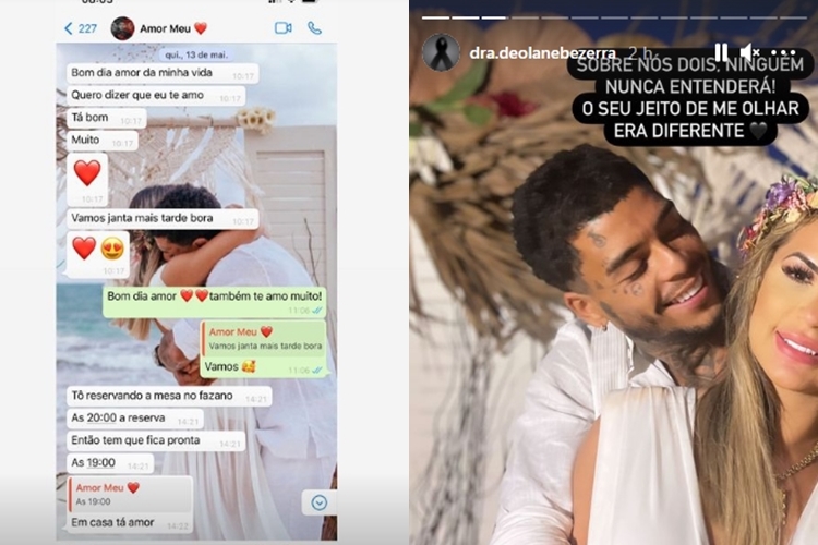 “Bom dia, amor da minha vida. Quero dizer que eu te amo. Tá bom? Muito! Vamos jantar mais tarde. Bora?”, escreveu o cantor no dia 13 de maio. Ela o respondeu: “Bom dia, meu amor. Também te amo muito. Vamos (jantar)”, escreveu. Naquele dia, os dois jantaram no Fasano, um restaurante de luxo em São Paulo. Ao mostrar a conversa, Deolane lamentou: “Nunca mais irei acordar assim”.