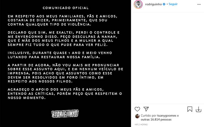 A postagem foi bloqueada para comentários. “Em respeito aos meus familiares, fãs e amigos, gostaria de dizer, primeiramente, que sou contra qualquer tipo de violência. Declaro que sim, me exaltei, perdi o controle e me envergonho disso. Peço desculpas à Nanah, que é a mãe dos meus filhos e a mulher a qual sempre fiz tudo o que pude para ver feliz.”, diz o comunicado.