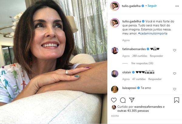 Depois que Fátima Bernardes revelou que descobriu estar com câncer de útero, Túlio Gadelha usou as redes sociais para se declarar para a amada. O político publicou uma foto da apresentadora em seu perfil no Instagram.
