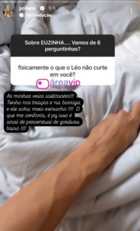 “Fisicamente o que o Léo não curte em você?“, quis saber uma fã. Logo, ela respondeu: “As minhas veias saltitantes! Tenho nos braços e na barriga e ele acha meio estranho! O que me conforta é porque isso é sinal de percentual de gordura baixo“, compartilhou ela, revelando a curiosidade sobre sua intimidade.