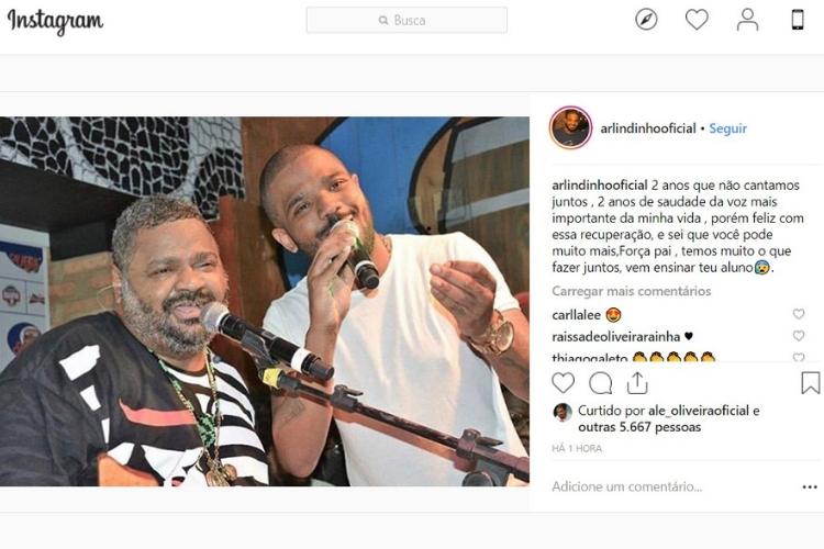“2 anos que não cantamos juntos, 2 anos de saudade da voz mais importante da minha vida, porém feliz com essa recuperação e sei que você pode muito mais. Força pai, temos muito o que fazer juntos, vem ensinar teu aluno”, escreveu Arlindinho.