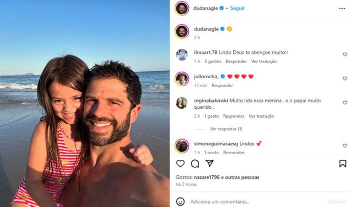 Para legendar o momento pai e filha, o ator apenas usou um emoji de sol e deixou seus seguidores comentarem: “Lindos“, elogiou uma. “Paizão“, destacou mais uma. “Como que a Sabrina perde um boy desses? Gatão e paizão“, elogiou uma terceira.