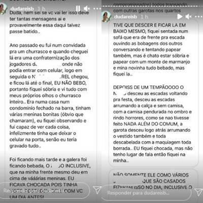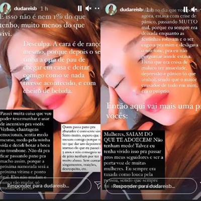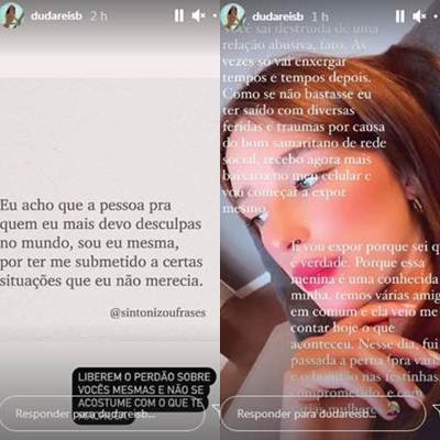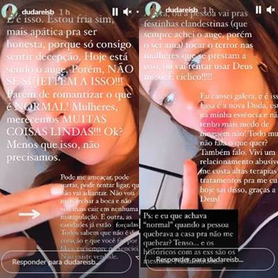 Em seguida, Duda começou a tecer comentários sobre relacionamentos. “Você sai destruída de uma relação abusiva, fato. Às vezes só vai enxergar tempos e tempos depois. Como se não bastasse eu ter saído com diversas feridas e traumas por causa do bom samaritano de rede social, recebo agora mais baixaria no meu celular e vou começar a expor mesmo. E vou expor porque sei que é verdade. Porque essa menina é uma conhecida minha, temos várias amigas em comum e ela veio me contar hoje o que aconteceu. Nesse dia, fui passada a perna (pra variar) e o bonitão nas festinhas, comprometido e com várias mulheres”, escreveu no stories.