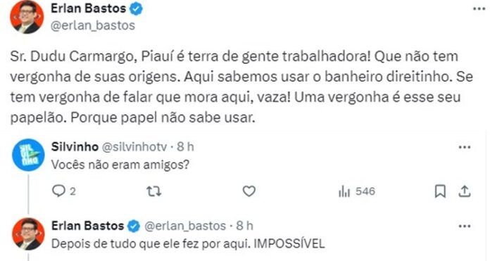 Depois de supostamente se recusar a comentar que reside no Piauí, em entrevista a RedeTV!, Dudu Camargo causou revolta em Erlan que, através do X (antigo Twitter), detonou a postura do contratado do Grupo Meio. “Sr. Dudu Camargo, Piauí é terra de gente trabalhadora! Que não tem vergonha de suas origens. Aqui sabemos usar o banheiro direitinho. Se tem vergonha de falar que mora aqui, vaza! Uma vergonha é esse seu papelão. Porque papel não sabe usar“, disparou ele.