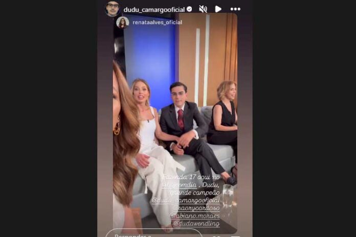Dudu compartilhou um registro da apresentadora do “Hoje em Dia”, Renata Alves, ao lado de Saory Cardoso, Fabiano Moraes e Duda Wendling, apresentando os finalistas da atração. “Equipe pesada”, disse a comunicadora.